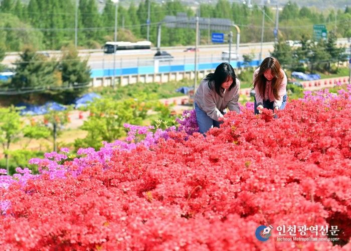 [인천광역신문] 최예준 기자 | 하남시 미사한강공원 2호 전망대 일대가 12만 본의 선홍빛 철쭉으로 물들어 장관을 연출하고 있다. 강바람을 따라 일렁이는 붉은 꽃물결이 시민들의 발길을 붙잡으며 도심 속 새로운 '봄의 성지'로 떠올랐다.