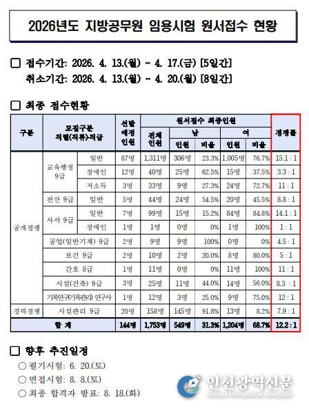 [인천광역신문] 최예준 기자 | 부산광역시교육청은 지난 13일부터 17일까지 실시한 ‘2026년도 지방공무원 임용시험’ 원서접수 결과 144명 선발에 1,753명이 지원해 평균 12.2대 1의 경쟁률을 보였다고 밝혔다.