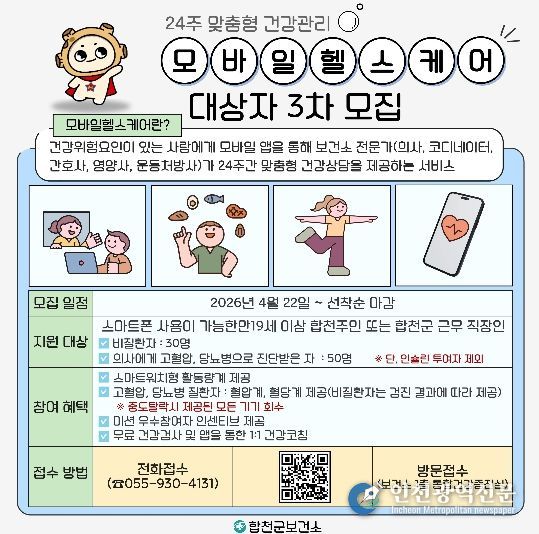 [인천광역신문] 최예준 기자 | 합천군보건소(소장 안명기)는 22일부터 모바일헬스케어 대상자 3차 모집을 시작한다.