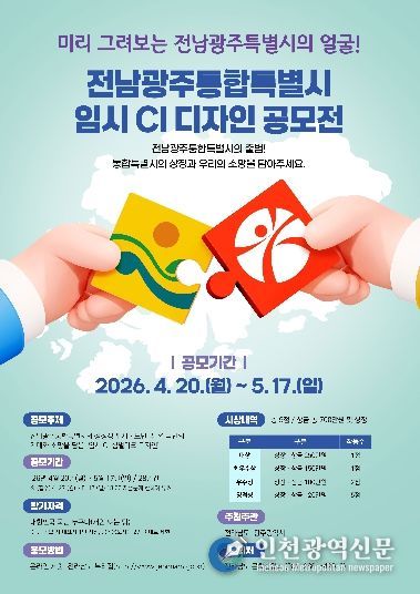 [인천광역신문] 최예준 기자 | 전라남도와 광주광역시는 통합특별시의 상징성을 나타내는 전남광주통합특별시 임시 CI 디자인을 5월 17일까지 28일간 전국민을 대상으로 공모한다고 밝혔다.