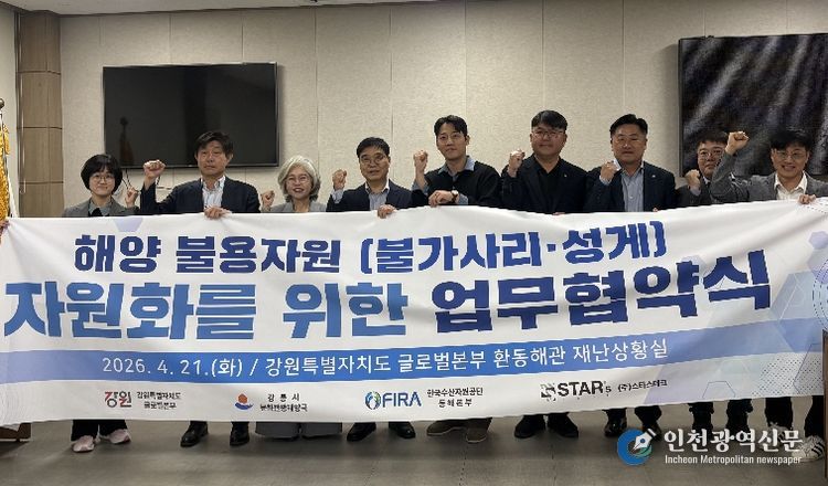 [인천광역신문] 최예준 기자 | 강릉시는 21일 강원특별자치도청 글로벌본부 환동해관에서 강원특별자치도, 한국수산자원공단 동해본부, ㈜스타스테크와 함께 ‘해양 불용자원 자원화를 위한 업무협약’을 체결했다고 밝혔다.