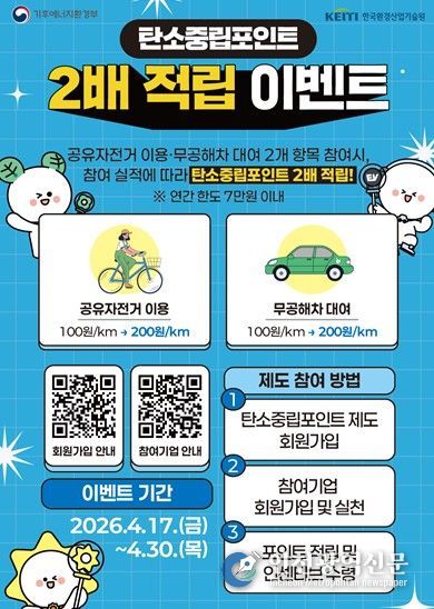 이벤트 기간은 4.17. ~ 4.30.까지 14일간이며, 해당기간에는 탄소중립포인트를 기존 100원/km에서 200원/km으로 2배 받을 수 있다. 다만 1인당 받을 수 있는 연간 7만원 한도는 변함이 없다.