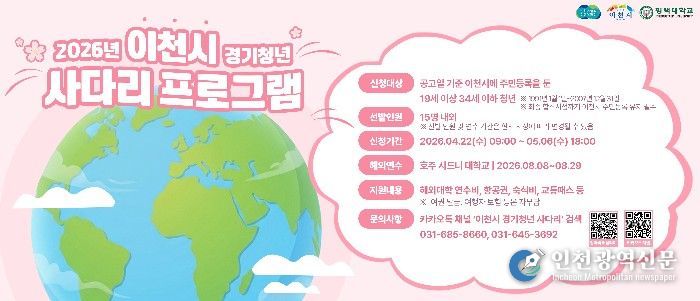 [인천광역신문] 최예준 기자 | 이천시는 지역 청년들에게 글로벌 경험을 제공하기 위해 '이천시 경기청년 사다리프로그램(운영기관: 평택대학교 산학협력단)' 2기 참여자를 모집한다고 밝혔다.