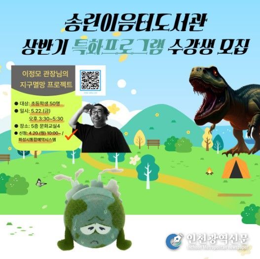 [인천광역신문] 최예준 기자 | 화성시문화관광재단 운영 화성시립송린이음터도서관은 상반기 특화프로그램으로 전 과천국립과학관 관장을 역임하고 현재는 과학커뮤니케이터로 과학의 대중화를 위해 애쓰고 있는 이정모 관장을 초청해 5월 22일 오후 3시 30분부터 5시 30분까지 송린이음터(화성시 만세구)에서 환경과 생태의 중요성을 재미있게 풀어내는 '지구멸망 프로젝트' 특강을 운영한다.