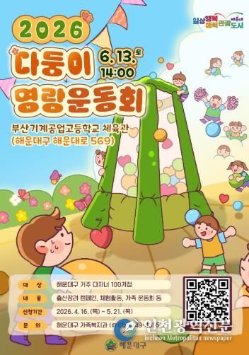 [인천광역신문] 최예준 기자 | 해운대구는 다자녀가정 우대 및 가족친화적 분위기 조성을 위해 '2026년 다둥이 명랑 운동회'에 참여할 다자녀가족 100가정을 모집한다.