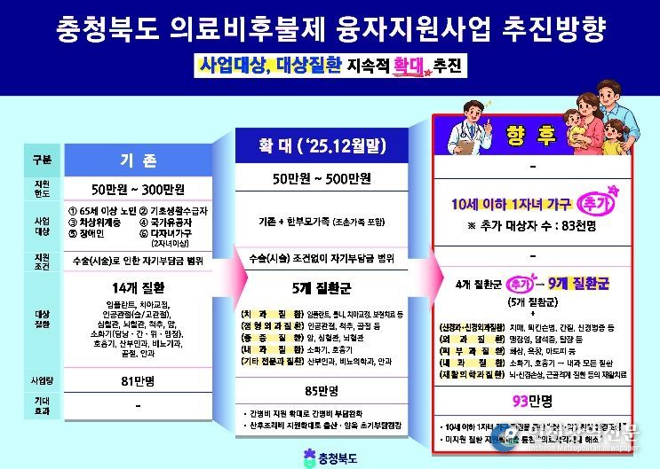 충청북도는 여기에서 더 나아가 지원 대상을 10세 이하 자녀를 둔 한 자녀 가정까지 확대하고, 신경과·외과·피부과·재활의학과 등 4개 질환군을 추가해 기존 5개 질환군에서 총 9개 질환군으로 확대할 계획이다. 이를 통해 보다 촘촘하고 빈틈없는 지원체계를 구축한다는 방침이다.