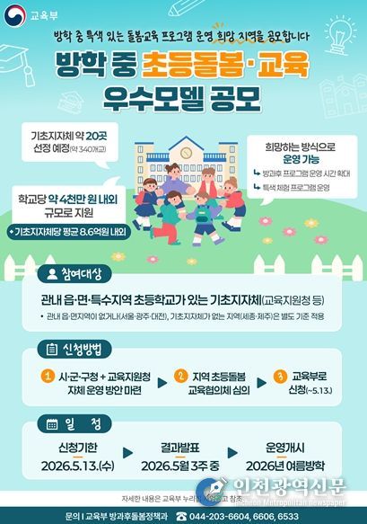 [인천광역신문] 최예준 기자 | 교육부는 4월 22일부터 5월 13일까지 2026년 방학 중 초등돌봄‧교육 우수모델을 운영할 기초지방자치단체 선정을 위한 공모를 실시한다.