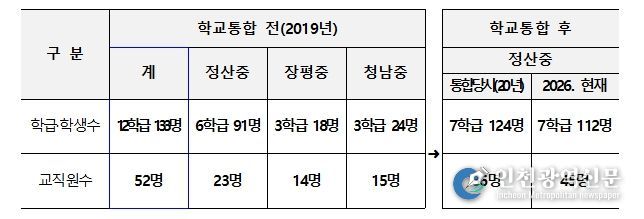 정산중학교는 1952년 개교 이후, 2020년 인근 청남중학교와 장평중학교를 통합해 기숙형 중학교로 재편·운영 중이다. 해당 학교는 통합 후 우수한 교육환경을 바탕으로 체계적인 교육과정을 운영하고 다양한 교육 프로그램을 제공함으로써 작은학교 혁신의 대표적 우수사례로 평가받고 있다.
