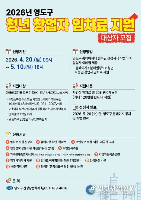 [인천광역신문] 최예준 기자 | 부산 영도구는 청년 창업가들의 경제적 부담을 덜어주고 지역 내 안정적인 사업 기반 마련을 돕기 위해 지난해에 이어 '2026년 청년 창업자 임차료 지원사업' 참여자를 모집한다고 밝혔다.