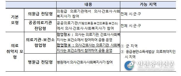 이번 공모에 신설된 모형을 포함한 재택의료센터 참여 모형은 다음 표와 같다.