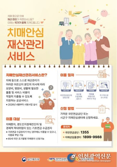 [인천광역신문] 최예준 기자 | 보건복지부는 4월 22일부터 ‘치매안심재산관리서비스 시범사업’을 실시한다고 밝혔다. 주요 대상은 치매, 경도인지장애 등으로 인해 경제적 학대 위험이 있는 기초연금수급자이며, 국민연금공단 7개 지역본부*에서 상담 받을 수 있다.