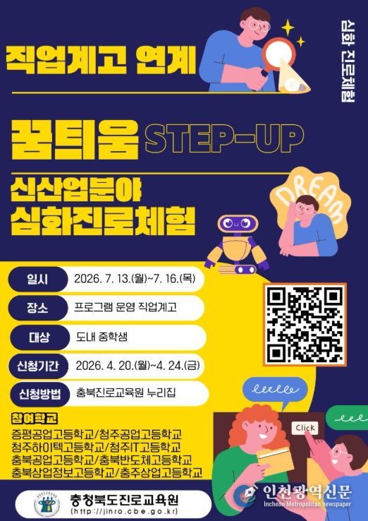 [인천광역신문] 최예준 기자 | 충청북도교육청 직속기관 진로교육원은 미래 신산업 분야에 대한 학생들의 진로설계 역량을 높이기 위해 '2026. 꿈틔움 STEP-UP 직업계고 연계 신산업 분야 심화 진로체험'을 운영한다고 밝혔다.