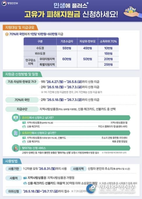 [인천광역신문] 최예준 기자 | 제천시는 최근 지속되는 고유가로 경제적 어려움을 겪고 있는 시민들의 생활 안정을 돕기 위해 ‘고유가 피해지원금’ 1차 지급을 본격 추진한다고 밝혔다.