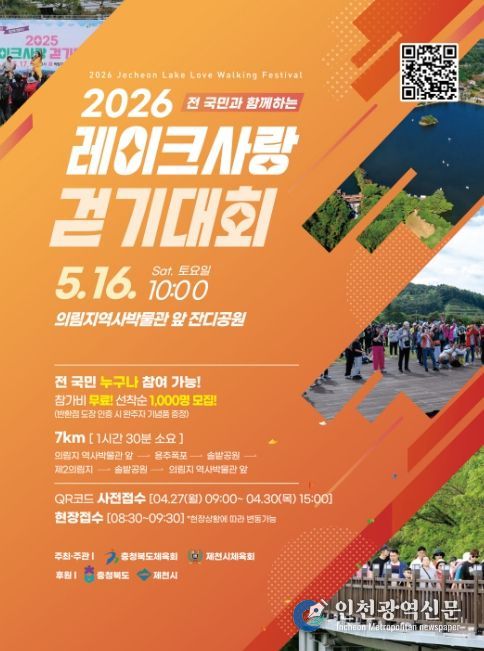 [인천광역신문] 최예준 기자 | 제천시체육회는 오는 5월 16일 의림지 일원에서 '2026 레이크사랑 걷기대회'를 개최한다고 밝혔다.