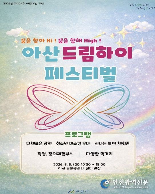 한편, 올해 '아산 드림하이 페스티벌'은 오는 5월 5일 어린이날 오전 10시 30분부터 오후 3시까지 아산문화공원 잔디광장 일원에서 열린다. 신정호수공원에서 이어져 온 어린이날 기념행사가 올해 처음으로 도심으로 개최 장소를 옮기게 됐으며, 아산시청 인근의 접근성 좋은 공간에서 진행되는 만큼 더욱 많은 시민이 편리하게 참여할 수 있을 것으로 기대된다.