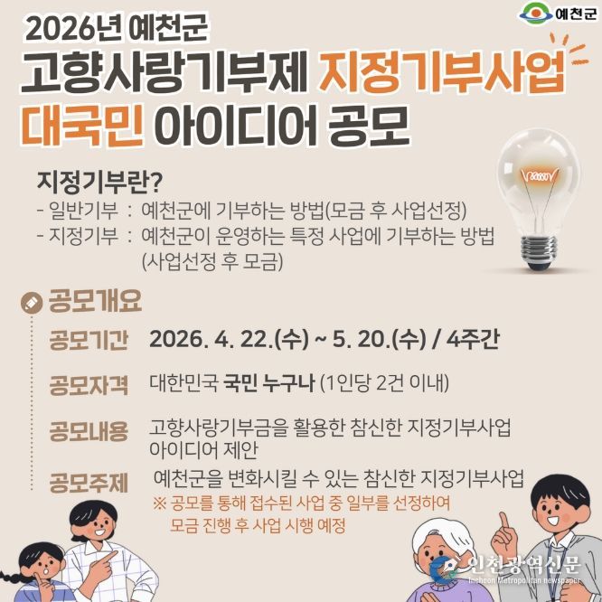 [인천광역신문] 최예준 기자 | 예천군은 기부자가 사업 목적에 공감하고 직접 수혜 대상을 결정하는 ‘고향사랑 지정기부제’를 적극 도입하기로 하고, 그 첫걸음으로 4월 22일부터 5월 20일까지 '2026년 예천군 고향사랑기부제 지정기부사업 아이디어 공모전'을 열어 국민들의 참신한 제안을 받는다.