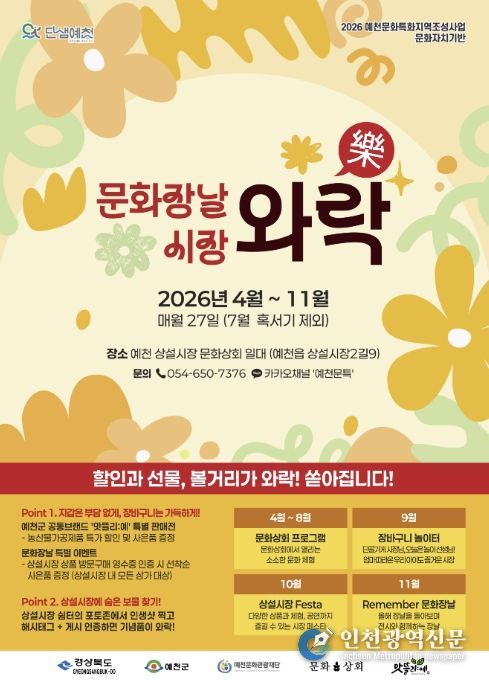 [인천광역신문] 최예준 기자 | (재)예천문화관광재단은 오는 4월 27일부터 11월까지 매달 27일, 예천 장날에 예천읍 상설시장 일대에서 ‘문화장날 시장와~락(樂)’을 개최한다.