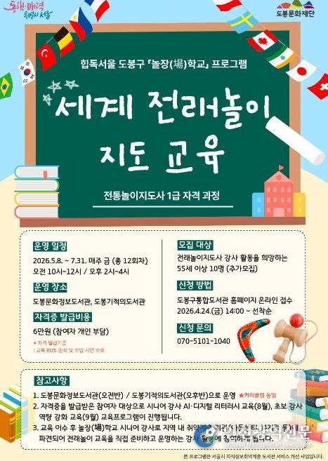 세계 전래놀이 지도 교육은 도봉문화정보도서관(오전반), 도봉기적의도서관(오후반)에서 운영되며 신청은 4월 24일 오후 2시부터 도봉구통합도서관 누리집에서 가능하다.