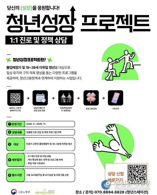 참여 신청은 청년스테이션 현장 또는 ‘고용24’ 누리집 내 청년성장프로젝트 페이지를 통해 가능하다. 프로그램은 5월부터 전문 상담사의 1대1 진단을 바탕으로 개인별 맞춤형 과정으로 운영된다.