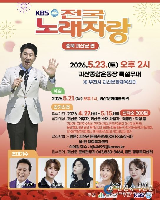 [인천광역신문] 최예준 기자 | 충북 괴산군은 군민 화합과 지역 홍보를 위해 ‘KBS 전국노래자랑 괴산군편’ 녹화를 오는 5월 23일 괴산종합운동장 특설무대에서 진행한다고 22일 밝혔다.