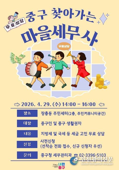 [인천광역신문] 최예준 기자 | 서울 중구는 구민들이 일상에서 겪는 세금 고민을 보다 쉽고 편하게 해결할 수 있도록 오는 29일 오후 2시 장충동 주민센터 2층에서 '찾아가는 마을세무사'를 운영한다.