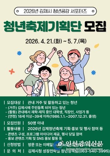 [인천광역신문] 최예준 기자 | 김제시는 청년이 주도하는 축제 기획을 통해 지역 청년 참여를 확대하고 활력을 불어넣고자 '청년축제기획단(김제시 청년공감 서포터즈)'을 모집한다고 밝혔다.
