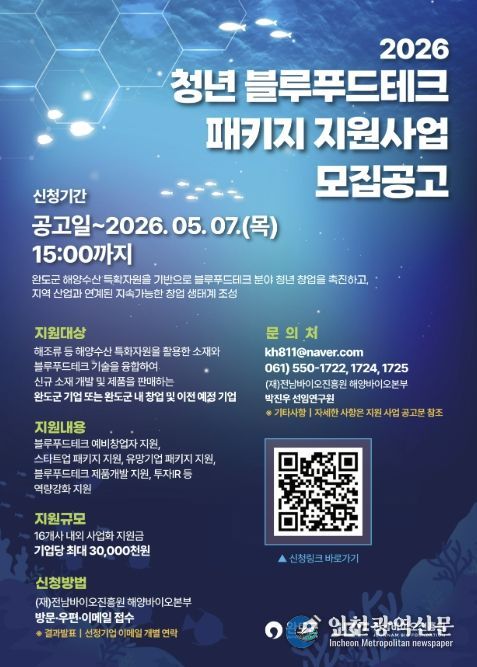 [인천광역신문] 최예준 기자 | 완도군은 지역의 해양 수산 자원을 고부가가치로 전환하고 청년 창업을 돕기 위해 ‘2026년도 청년 블루푸드테크 패키지 지원 사업’ 참가자를 모집한다.