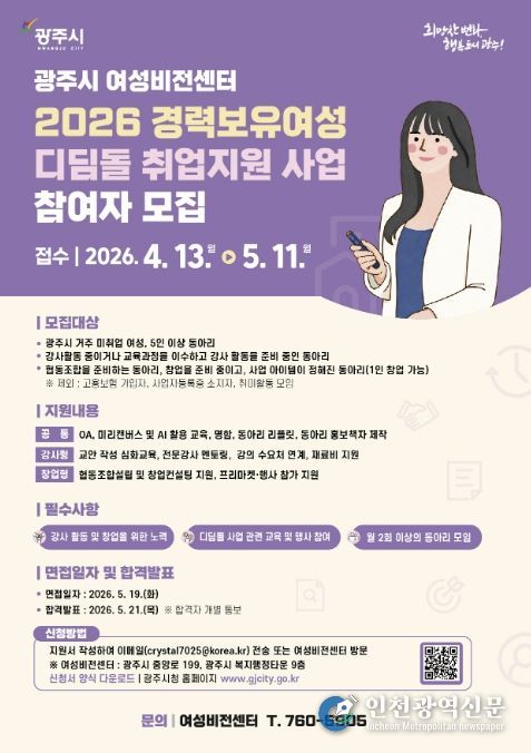[인천광역신문] 최예준 기자 | 광주시는 지역 내 경력보유여성의 사회 재진출과 취업 역량 강화를 위해 ‘2026 경력보유여성 디딤돌 취업 지원 사업’ 참여자를 오는 5월 11일까지 모집한다고 22일 밝혔다.