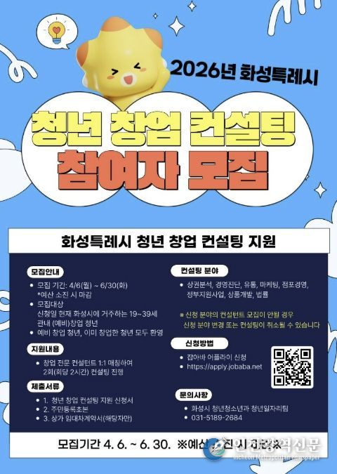 [인천광역신문] 최예준 기자 | 화성특례시는 오는 6월 30일까지 ‘2026년 청년 창업 컨설팅 지원사업’ 참여자를 모집한다.