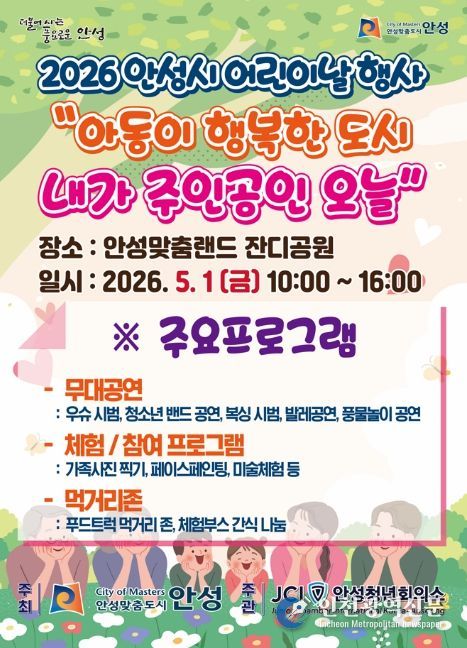 [인천광역신문] 최예준 기자 | 안성시가 주최하고 안성청년회의소가 주관하는 ‘제104회 어린이날 기념행사’가 오는 5월 1일 노동절, 안성맞춤랜드에서 개최된다.