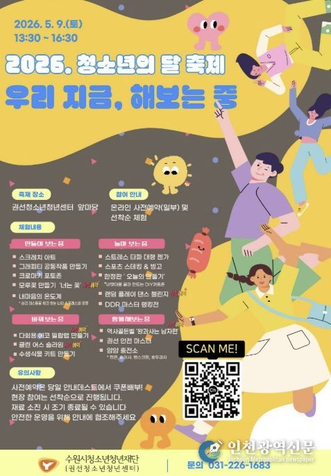 [인천광역신문] 최예준 기자 | 수원시청소년청년재단 권선청소년청년센터가 오는 5월 9일, 청소년이 주인공이 되어 직접 경험하고 도전하는 참여형 축제 ‘지금우리, 해보는중’을 개최한다고 밝혔다.