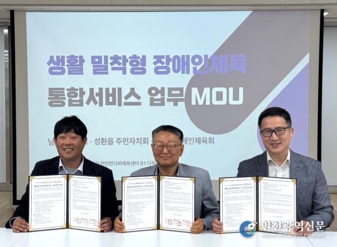 [인천광역신문] 최예준 기자 | 천안시장애인체육회는 22일 천안반다비체육센터에서 성환읍 주민자치회, 남서울대학교와 ‘생활밀착형 장애인체육 통합서비스 구축을 위한 업무협약’을 체결했다.