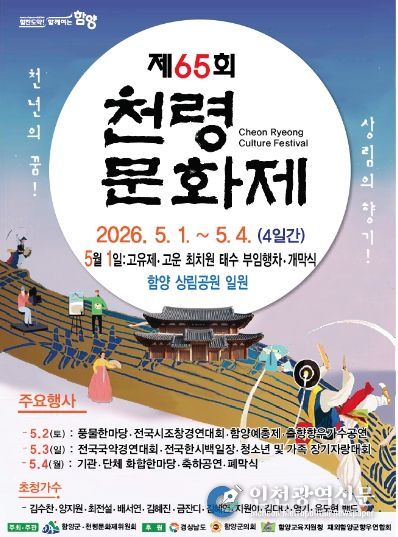 [인천광역신문] 최예준 기자 | 함양군을 대표하는 종합문화축제 ‘제65회 천령문화제’가 오는 5월 1일부터 4일까지 4일간 천년의 숲 상림공원 일원에서 열린다.