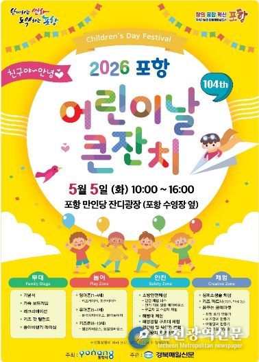 [인천광역신문] 최예준 기자 | 포항시는 제104회 어린이날을 맞아 내달 5일 남구 만인당 잔디광장에서 ‘2026 포항 어린이날 큰 잔치’를 개최한다.