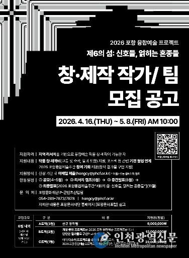[인천광역신문] 최예준 기자 | (재)포항문화재단은 ‘포항 융합예술 플랫폼’(포항의 융합예술 인프라)을 기반으로, 융합예술 분야에서 창의적 성과를 만들어갈 창·제작 팀을 공개 모집한다.