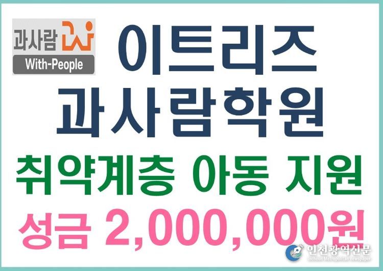 이번 성금은 경제적 어려움을 겪고 있는 저소득 취약계층 아동 20명의 학업 지원을 위해 마련됐으며, ㈜이트리즈 과사람학원은 매년 상·하반기 저소득 아동을 위한 후원을 꾸준히 이어오며 지역사회 나눔 문화 확산에 기여하고 있다.