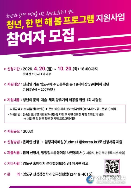 [인천광역신문] 최예준 기자 | 부산 영도구는 청년들에게 문화 향유 기회를 제공하고 지역 청년문화 활성화를 도모하기 위해 '청년, 한 번 해 봄 프로그램 지원사업' 참여자를 이달 20일부터 10월 20일까지 모집한다고 밝혔다.