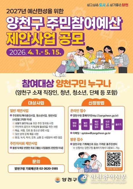 [인천광역신문] 최예준 기자 | 양천구는 2027년 예산 편성 과정에 구민의 목소리를 반영하기 위해 ‘주민참여예산 제안사업’ 공모를 오는 5월 15일까지 진행한다고 밝혔다.