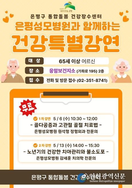 [인천광역신문] 최예준 기자 | 서울 은평구는 다음 달 6일과 13일 구민의 건강한 노후생활을 지원하기 위해 65세 이상 어르신을 대상으로 ‘건강특별강연’을 운영한다고 밝혔다.