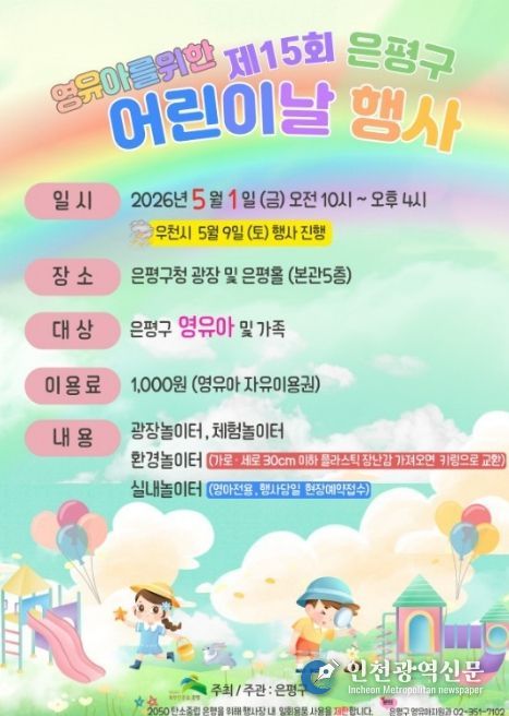 [인천광역신문] 최예준 기자 | 서울 은평구는 어린이날을 맞아 내달 1일 은평구청 광장과 은평홀에서 ‘제15회 영유아를 위한 어린이날 행사’를 개최한다고 밝혔다.