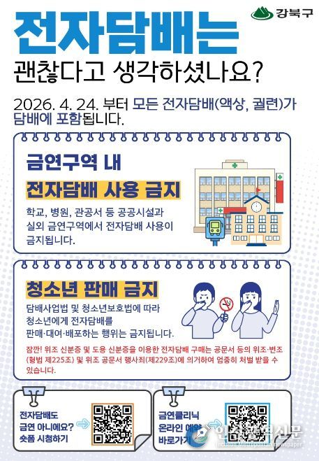 이순희 강북구청장은 “전자담배 역시 금연구역에서 사용할 수 없는 대상이라는 점을 분명히 알리고, 청소년 보호와 간접흡연 예방을 위해 법령 준수가 필요하다”며 “앞으로도 금연 환경 조성과 구민 건강 증진을 위한 정책을 지속적으로 추진하겠다”고 말했다.