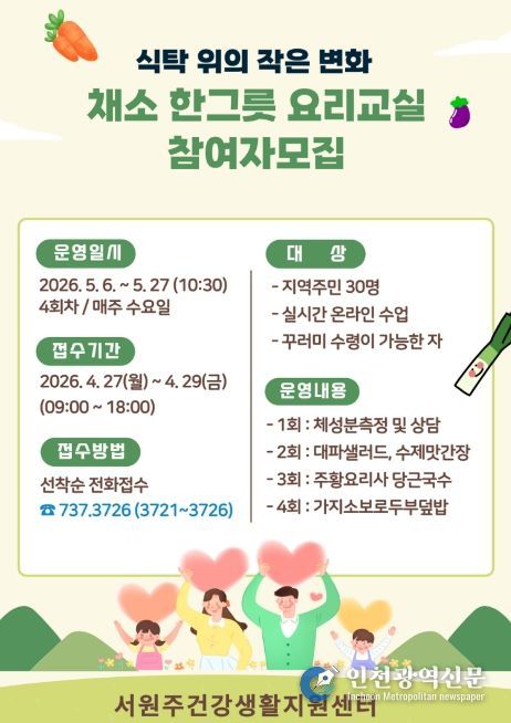 [인천광역신문] 최예준 기자 | 서원주건강생활지원센터는 증가하는 만성질환에 대응하기 위한 ‘식탁 위의 작은 변화, 채소 한그릇 요리교실’ 프로그램 참여자를 모집한다.