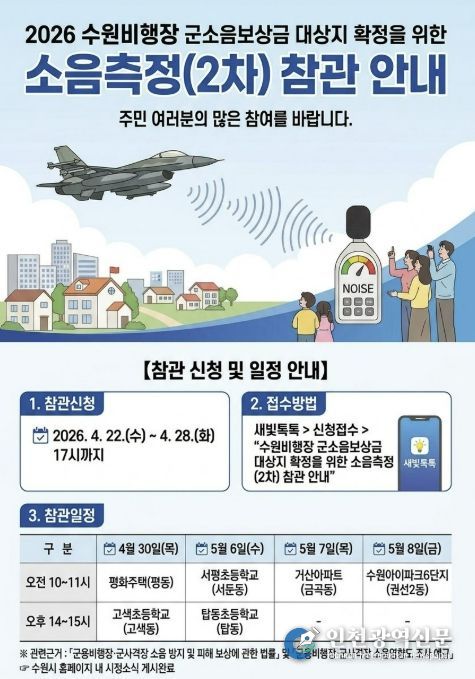[인천광역신문] 최예준 기자 | 수원특례시가 수원비행장 인근 주민들의 소음 피해 보상 근거가 될 국방부의 ‘수원비행장 소음 영향도 조사 2차 소음측정’ 주민 참관 참여자를 모집한다. 4월 28일까지 새빛톡톡으로 신청할 수 있다.