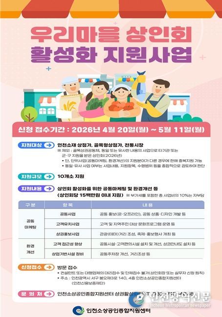 [인천광역신문] 최예준 기자 | 인천광역시는 지역 상권의 자생력 강화와 골목경제 활성화를 위해 ‘2026년 우리마을 상인회 활성화 지원사업’을 본격 추진한다고 밝혔다.