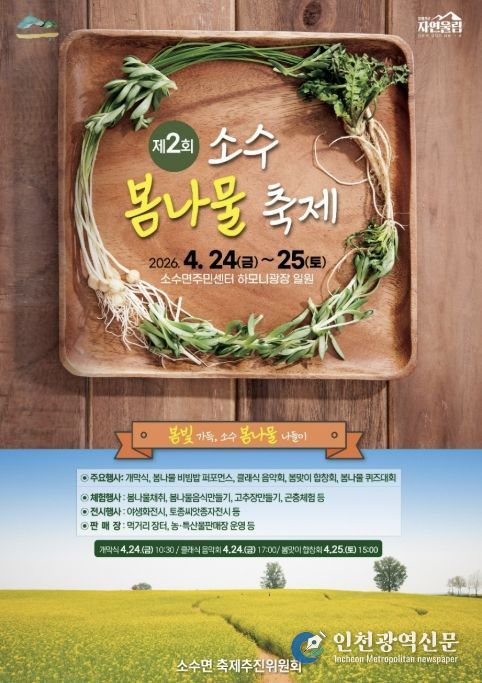 [인천광역신문] 최예준 기자 | 충북 괴산군 소수면축제추진위원회는 오는 24일부터 25일까지 이틀간 소수면 하모니광장 일원에서 ‘제2회 소수봄나물축제’를 연다.