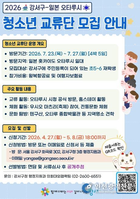 [인천광역신문] 최예준 기자 | 서울 강서구는 자매도시인 일본 오타루시와의 우호를 강화하고, 지역 청소년에게 특별한 해외 문화 체험의 기회를 제공하기 위해 ‘강서구-오타루시 청소년 교류단’ 참가자를 모집한다고 밝혔다.
