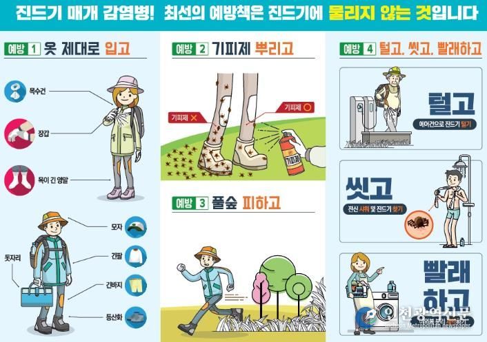 이에 시는 △야외활동 시 긴팔·긴바지·긴양말 착용하기 △진드기 기피제 사용하기 △풀밭에 옷을 벗어두거나 바로 앉지 말고, 돗자리 사용하기 △귀가 후 즉시 샤워 및 세탁 등 예방수칙 준수를 권고하고 있다.