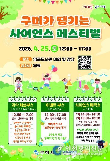 [인천광역신문] 최예준 기자 | 구미과학관은 4월 과학의 달을 맞아 4월 25일 구미어린이과학체험관(양포도서관 내) 일원에서 '구미가 땡기는 사이언스 페스티벌'을 개최한다. 과학을 놀이처럼 즐길 수 있도록 구성한 참여형 행사로, 시민 누구나 부담 없이 참여할 수 있다.
