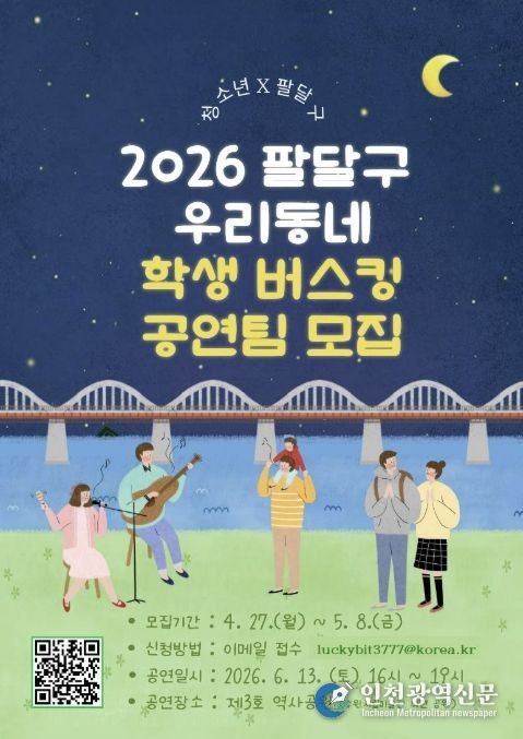 [인천광역신문] 최예준 기자 | 수원시 팔달구가 청소년들이 직접 주인공이 되어 공연에 참여하고 즐기는 ‘2026 팔달구 우리동네 학생 버스킹’의 공연팀을 모집한다고 밝혔다.