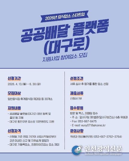 [인천광역신문] 최예준 기자 | 대구 달서구는 신규 외식업소의 조기 정착과 경영 안정화를 돕기 위해 ‘2026년 외식업소 스타트업 공공배달 플랫폼 지원사업’을 추진한다.